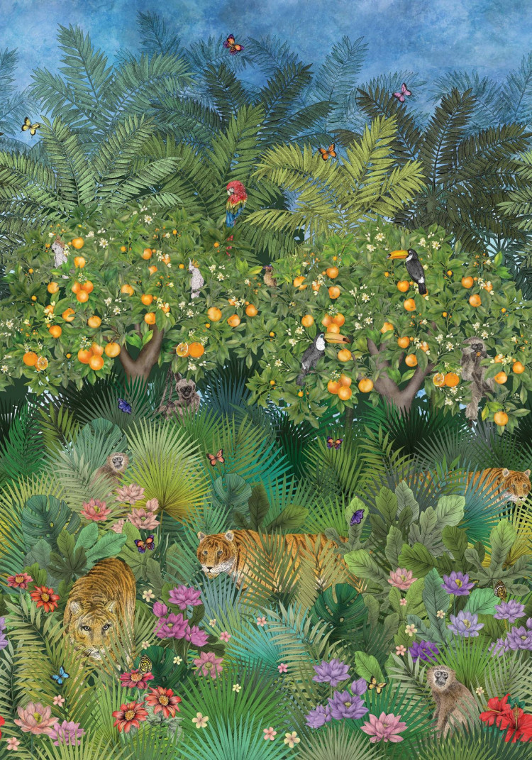 Carta da parati che rappresenta una lussureggiante giungla con tigri, pappagalli, palme ed aranci. Pannello formato da 3 teli di cm 70 h. 300 - misura totale cm 210 x 300, abbinabile al pannello ORANGE GROVE