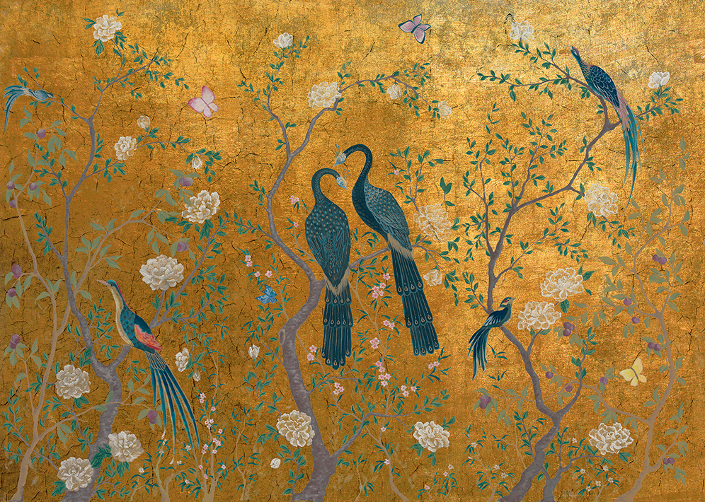Carta parati d'ispirazione orientale che forma un pannello murale con bellissimi rami e fiori su cui poggiano due graziosi volatili. Disponibile la versione in colori metallici. PREZZO AL MQ CONFIGURATE LE MISURE PER AVERE IL COSTO DELLA VOSTRA PARETE