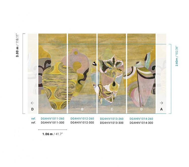 Carta parati panoramica firmata Masureel, meravigliosi vasi dipinti in colori vivaci e decorativi. l disegno completo si compone di 3 pannelli da cm 106 l'uno, acquistabili singolarmente o due o tre, per un totale di cm 424, disegno ripetibile. Altezza cm 260 o cm 300. Il prezzo è per pannello da cm 106 h. 300