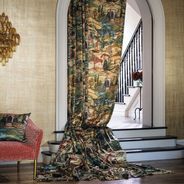 Tessuto in morbido intreccio di ciniglia caratterizzato da una striscia multicolore di rombi